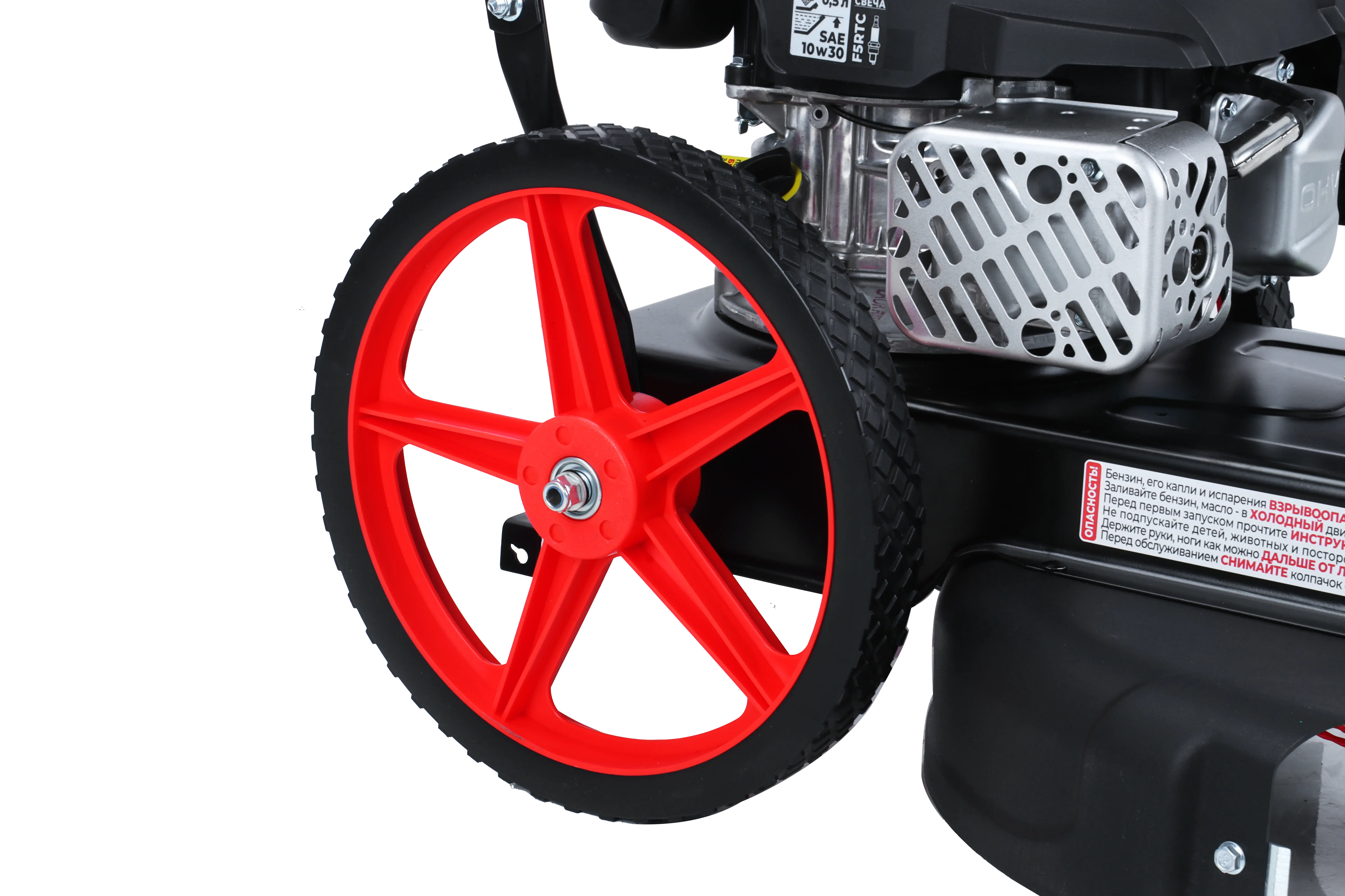 Колесный триммер очень удобен для работы: благодаря колесам, его не нужно переносить на плечах, как обычный бензиновый триммер, поэтому без усталости можно обрабатывать площади больше, чем обычным бензиновым триммером.